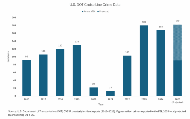 The recent data continues the troubling trend of increasing crime on cruise ships. Crime has nearly doubled from 92 reported incidents in 2016 to a projected 182 crimes by the end of this year. Crime plummeted during the COVID-19 pandemic only to rebound to an all-time high in 2023 with no signs of decreasing. A chart summarizing the data from 2016-2025 is below.